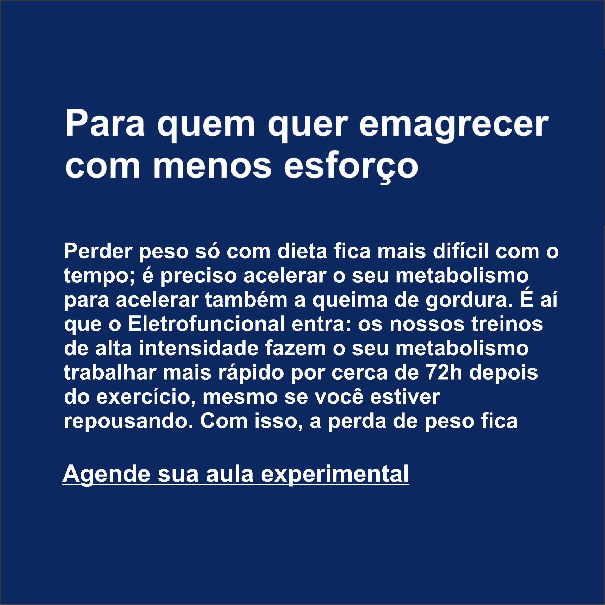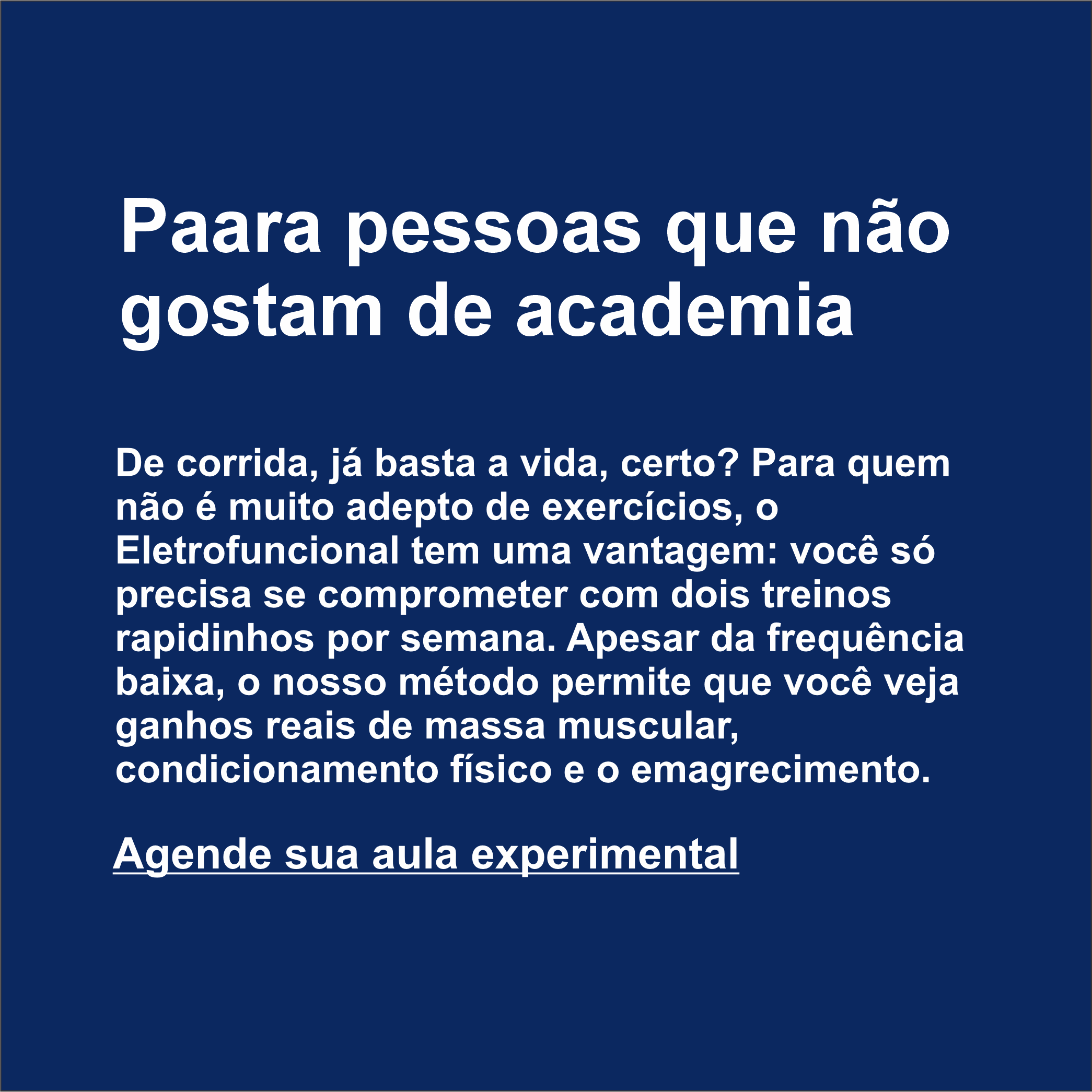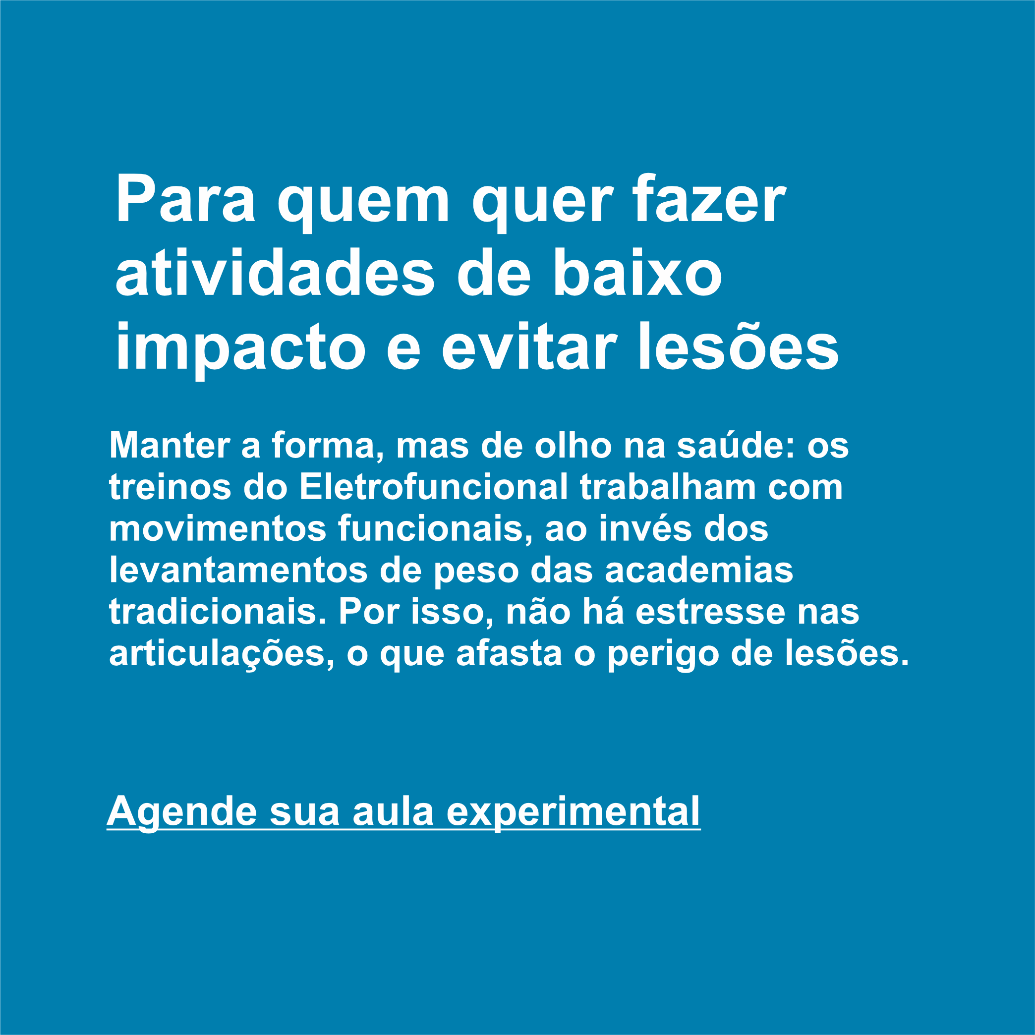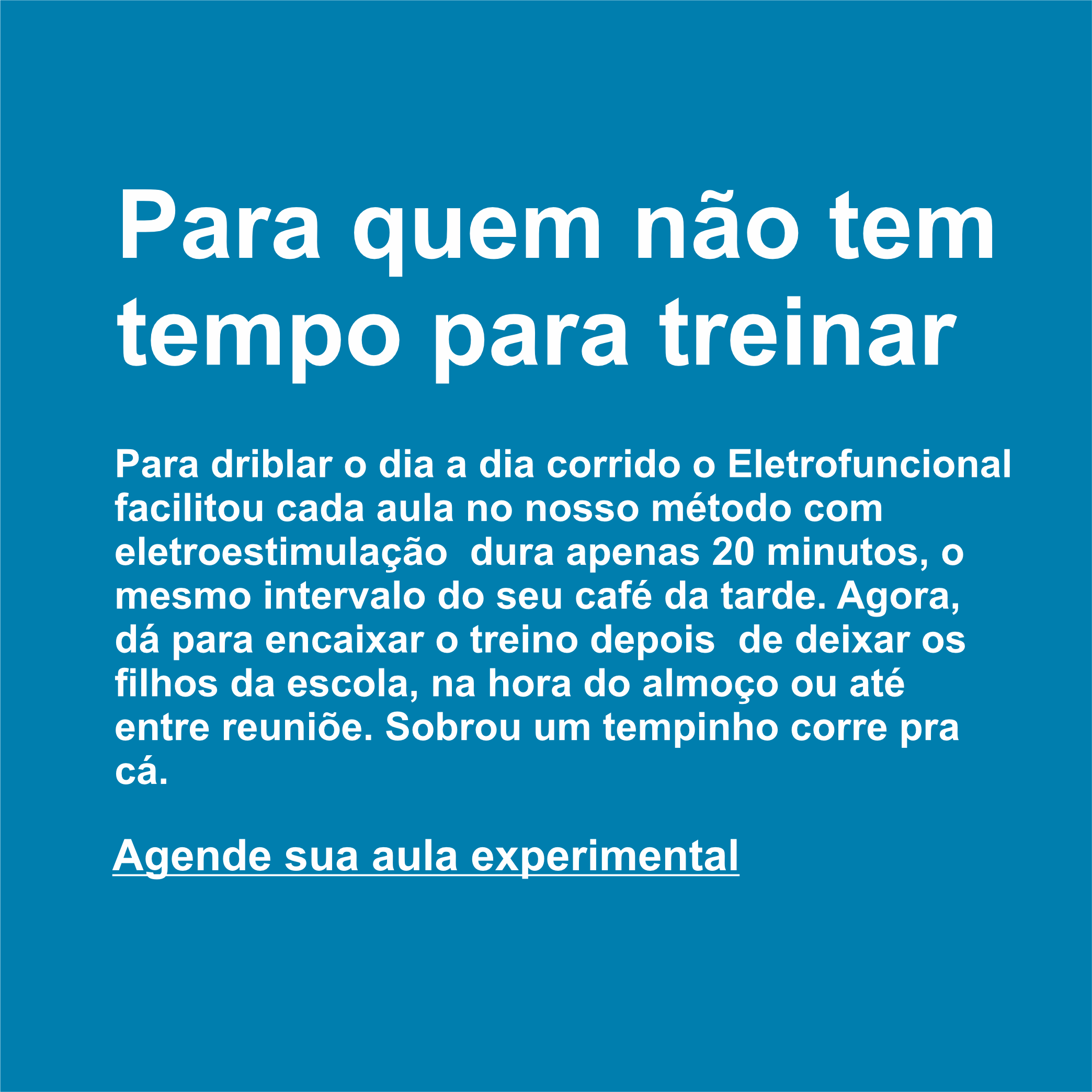O método Eletrofuncional combina exercicio funcional com a tecnologia de Eletroestimulação para garantir um trabalho muscular mais intenso e ativação de mais de 300 músculos sem a necessidade de uso de sobrecargas, em uma sessão de treino de apenas 20 minutos, duas vezes por semana ira potencializar seus resultados.